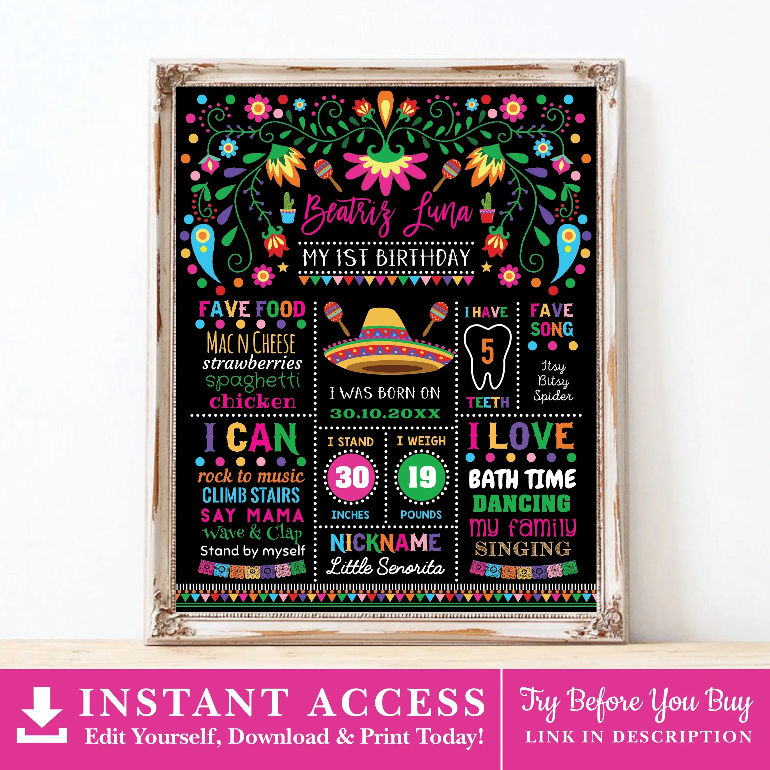 Editable Fiesta Birthday Chalkboard Sign 1st Birthday Milestone