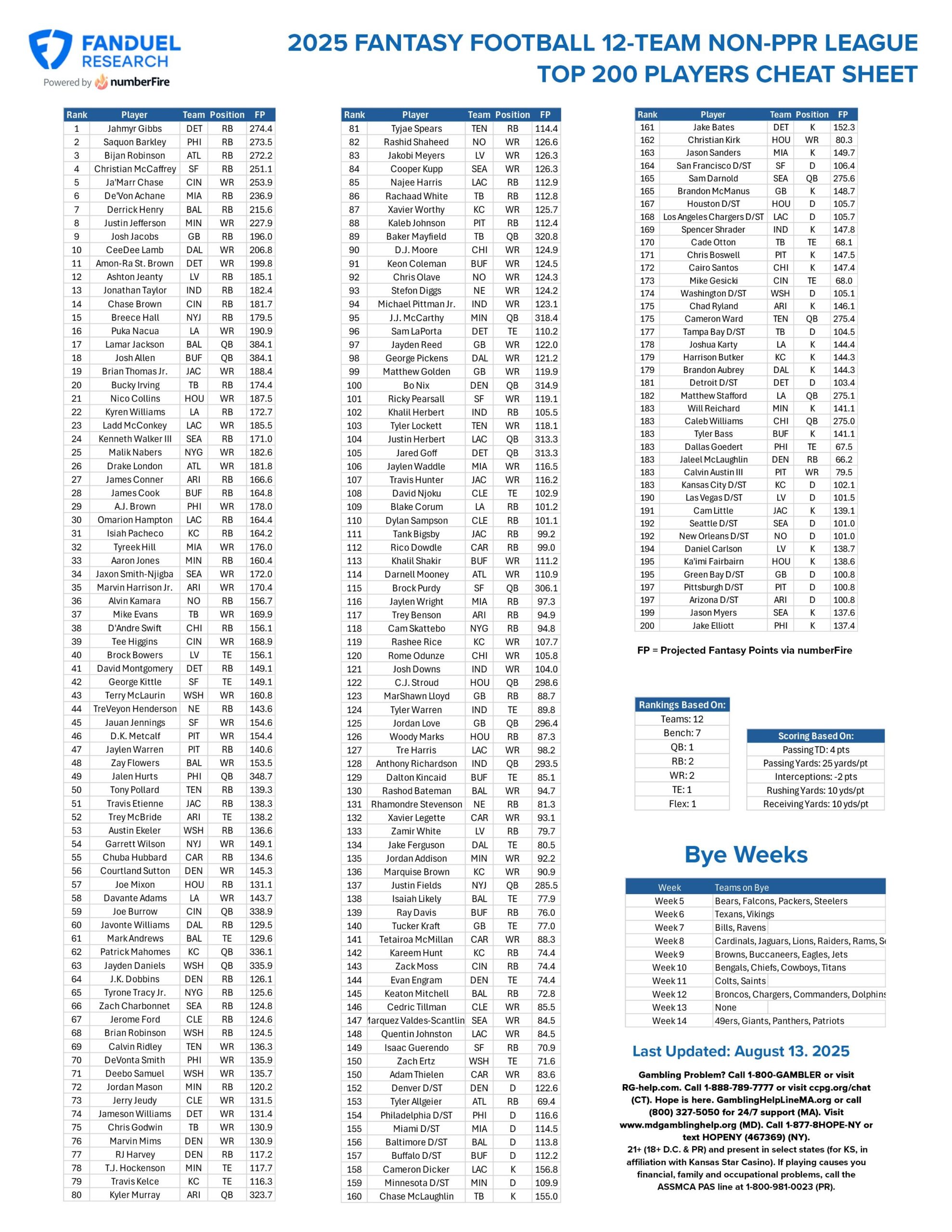 Fantasy Football Printable Cheat Sheet Top 200 Players For 12