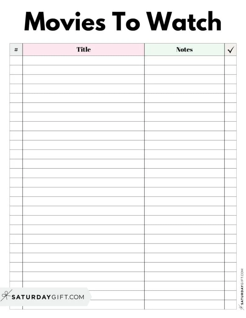Whether you’re into action-packed blockbusters, heartwarming rom-coms, or spine-tingling thrillers, our printable has space for all your favorite genres. You can also make notes about where to watch each movie, so you’re always prepared for your next movie night.