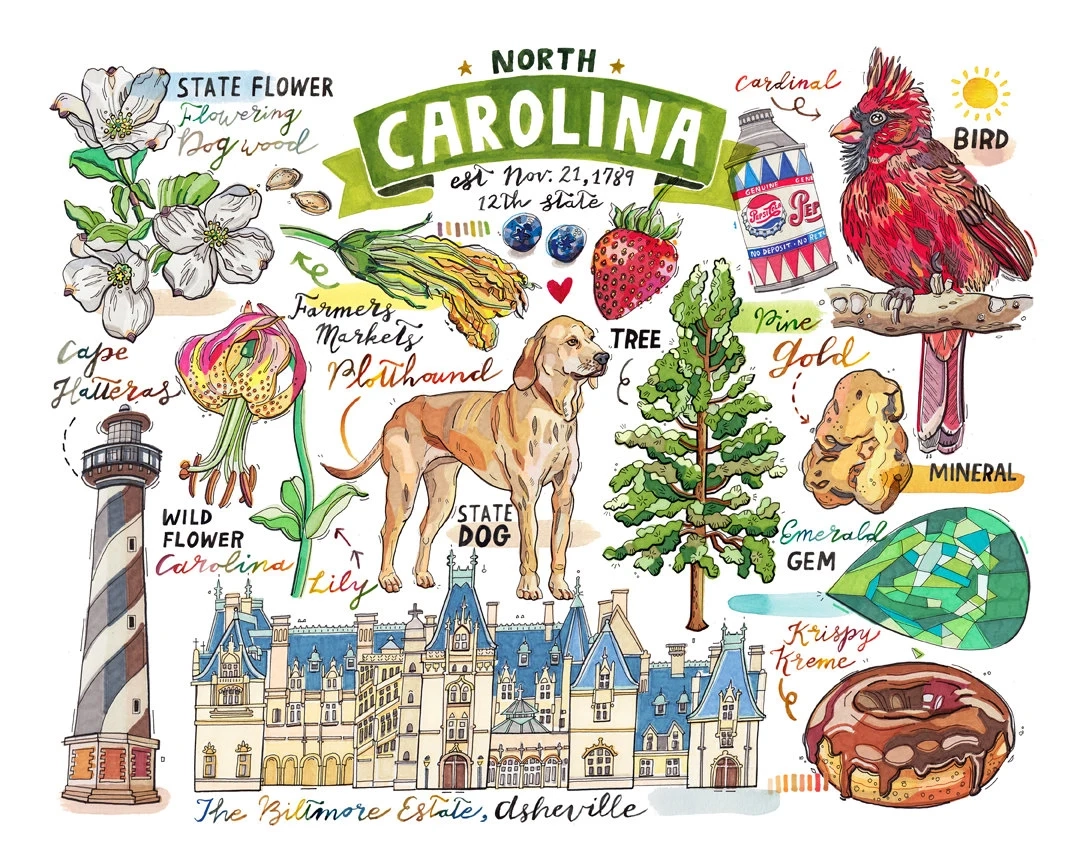 North Carolina Print State Symbols Illustration State Art