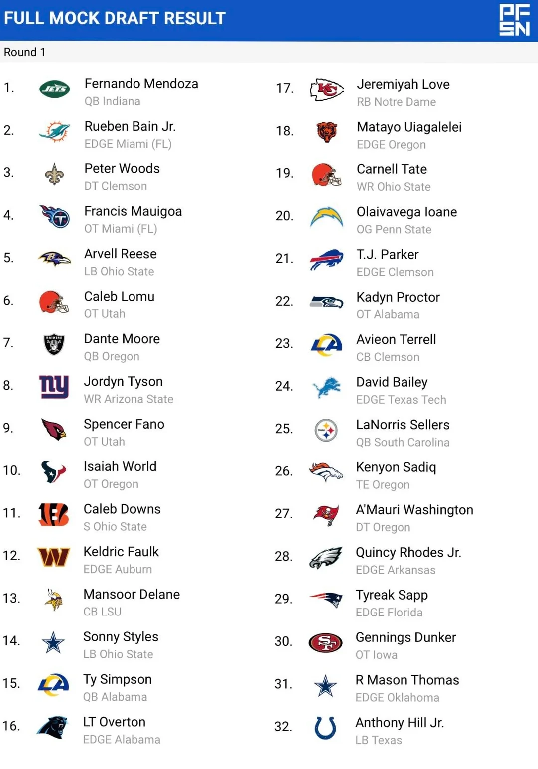 Printable 2026 NFL Draft List