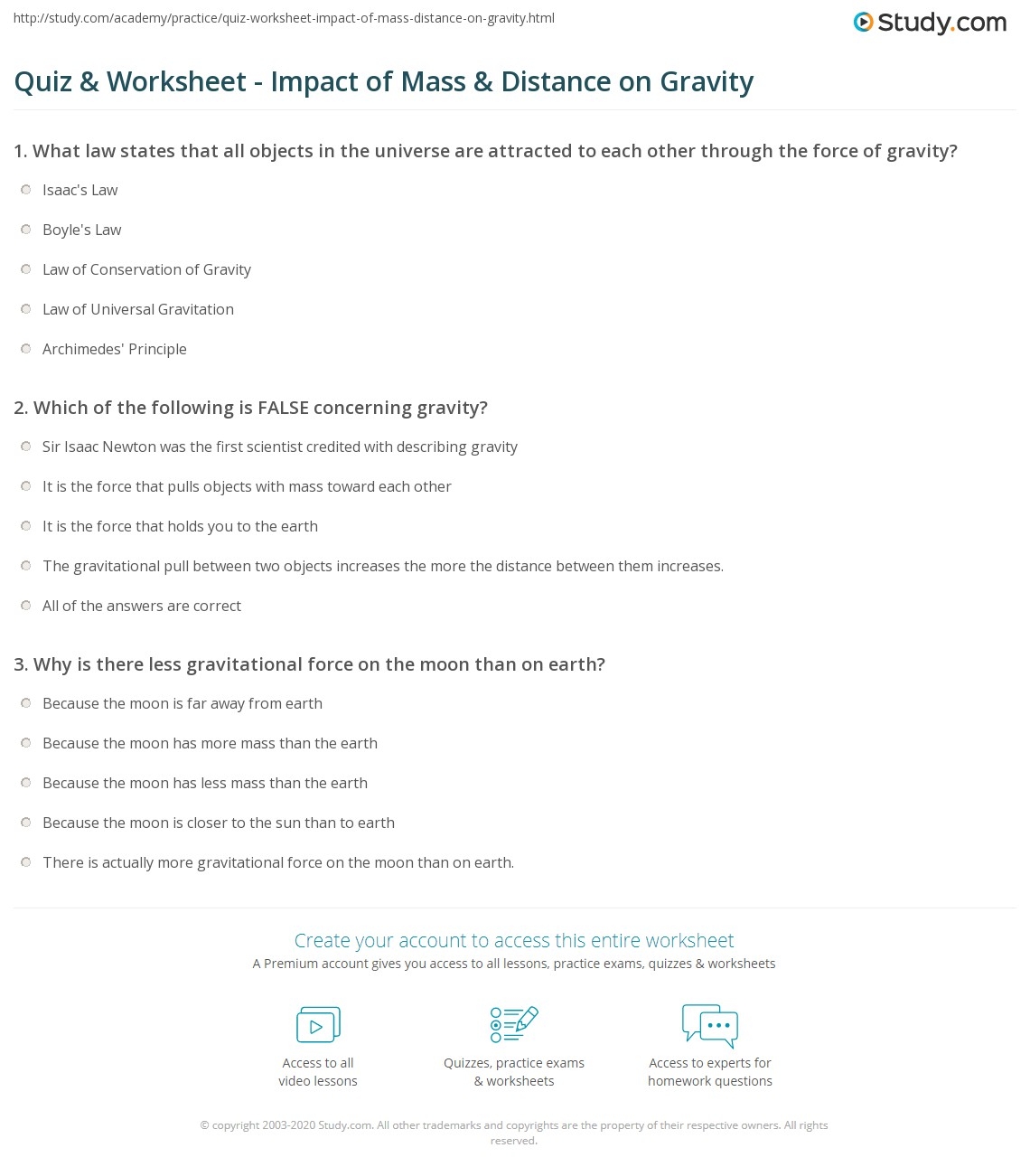 Quiz amp Worksheet Impact Of Mass amp Distance On Gravity Study