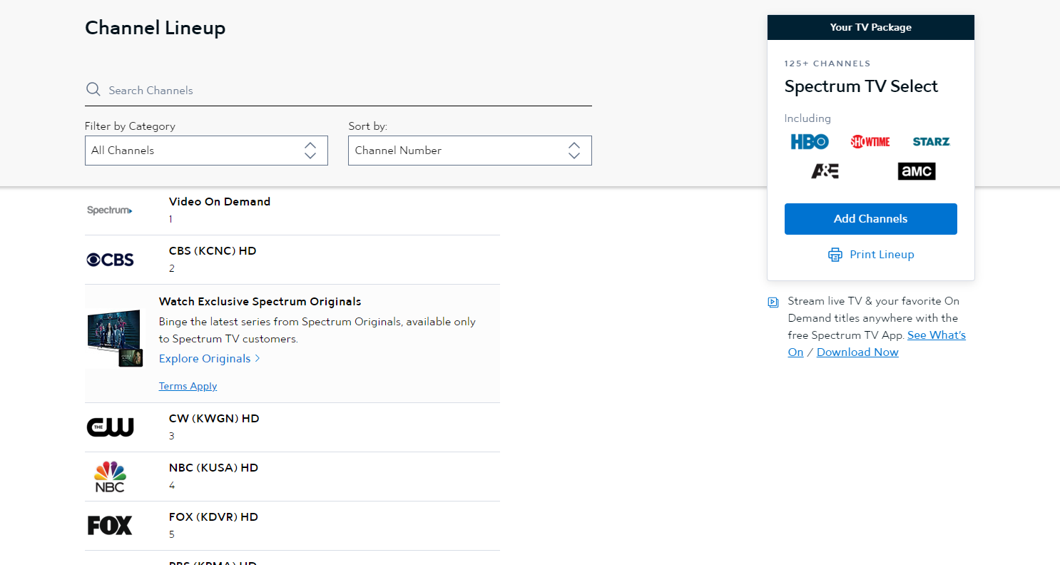 With Spectrum TV Choice, you have the flexibility to choose the channels you want to watch without being tied down to a lengthy contract. Our printable channel lineup is just another way we make it easy for you to customize your TV viewing experience to suit your preferences.