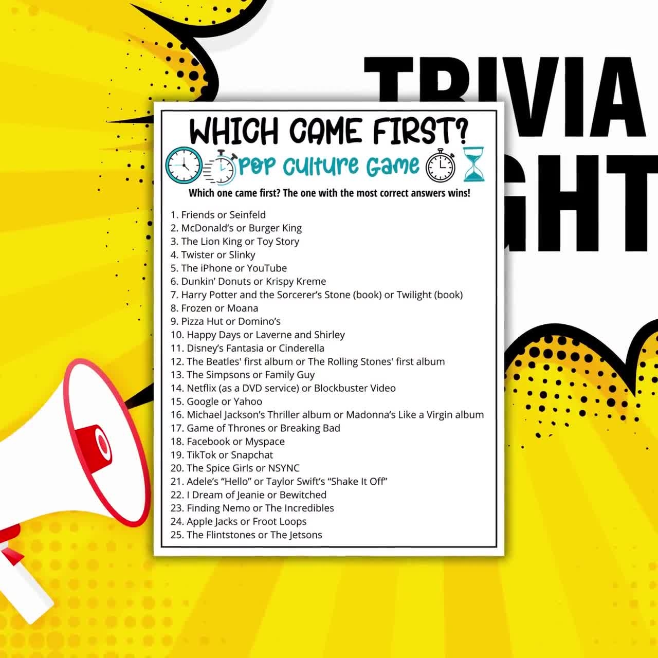 Pop Culture Trivia Game Guess Which Came First Quiz Printable Game For Kids amp Adults Family Game Movie Night Office Party Fun TV Music Quiz